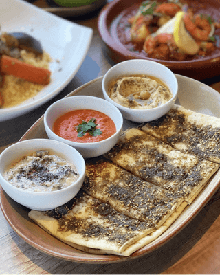 Spicy (mild). Selection of 3 house made dips (Hummus, Baba Ghanoush & Muhamarah Dip) served with zaatar bread