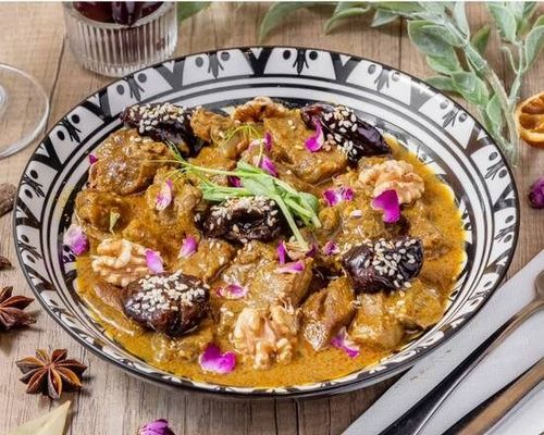 Slow cooked lamb in sweet savoury Moroccan stew, infused with prunes, walnuts & aromatic spices
