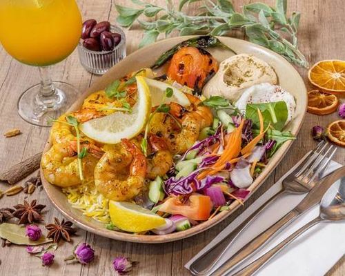 Local Grilled King prawns, Grilled tomato, served with saffron rice & fresh salad