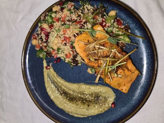Grilled Salmon served with pesto hummus and couscous salad