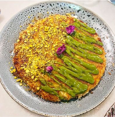 Kunafa is shredded phyllo dough, sweet rose syrup, cream and cheesy filling (boccaccini, Mozzarela) topped with pistachios.