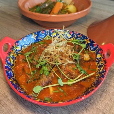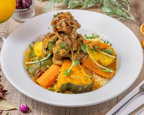 Traditional Moroccan handmade couscous, Slow cooked lamb & seasonal Veggies, topped with caramelised onions & sultanas