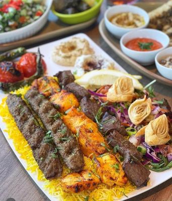 Selection of 3 dips (hummus, baba ghanoush, muhammarah); Za'atar bread, vine leaves, tabbouleh salad; Charcoal grilled mixed platter; Lamb kofta, chicken taouk, beef meshwi, grilled tomato & chilli, served with organic saffron rice; Fattoush salad.