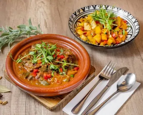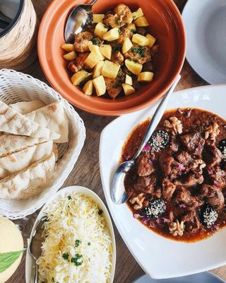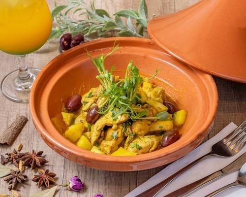Selection of 3 dips (hummus, baba ghanoush, muhammarah); Za'atar bread, vine leaves, zaalouk; Boneless chicken cooked with saffron, confit lemon, olives, crispy potatoes & cilantro; Slow cooked lamb with prunes, almonds & sesame seeds; Saffron rice, batbout bread.