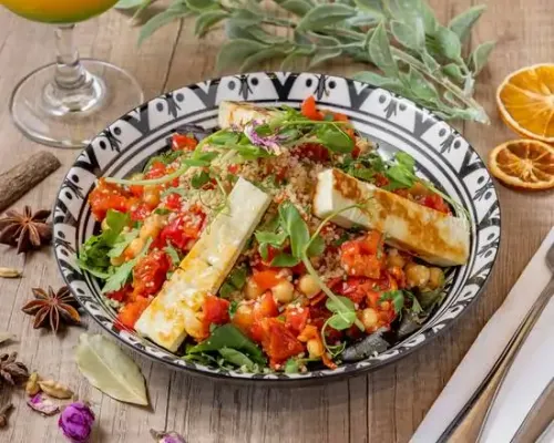 Housemade Couscous, Pepper, Parsley, Lettuce, Chickpeas, Sun-dried Tomato, Honey & Lemon Glazed Haloumi Cheese