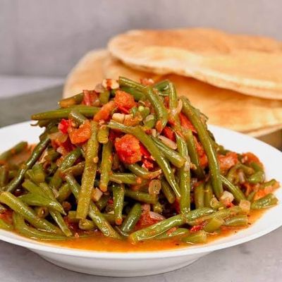 Moroccan green bean stew in a zesty tomato sauce, onions, garlic, & aromatic spices