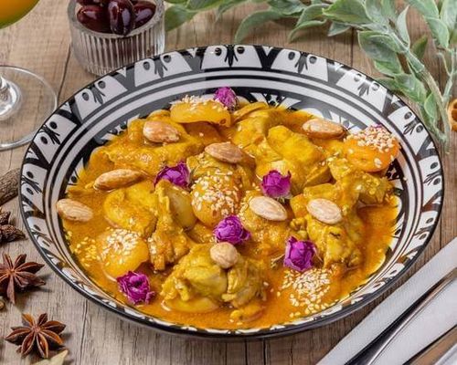 Spicy (mild). Five spice marinated chicken cooked with caramelized onion, apricots & almonds