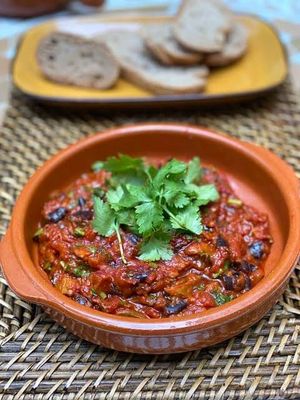 Moroccan eggplant stew cooked in rich tomato sauce and spices, served with bread