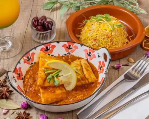 Moroccan style baked barramundi, aromatic spices, saffron rice, Moroccan Muhammara sauce